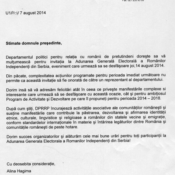 Asociația Românii Independenți din Serbia, veritabil catalizator pentru comunitatea românească din Serbia ris18 august 2014 Noutăți