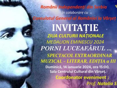 Activități RIS Eveniment dedicat Zilei Culturii Naționale, Porni Luceafărul, ediția a III-a, Serbia Asociația de interes obștesc „Românii Independenți din Serbia RIS” organizează evenimentul dedicat Zilei Culturii Naționale ...